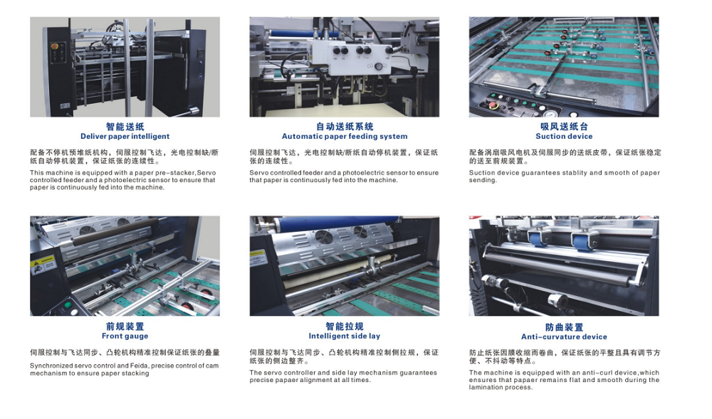 3. Табелата за хранење хартија усвојува хранење хартија за вшмукување, серво мотор и е опремена со преден мерач, мерач на влечење и други уреди за да се обезбеди непречено и уредно хранење хартија и редење на хартија, а во исто време ја подобрува точноста и прилагодливоста на ламинацијата на хартија.
